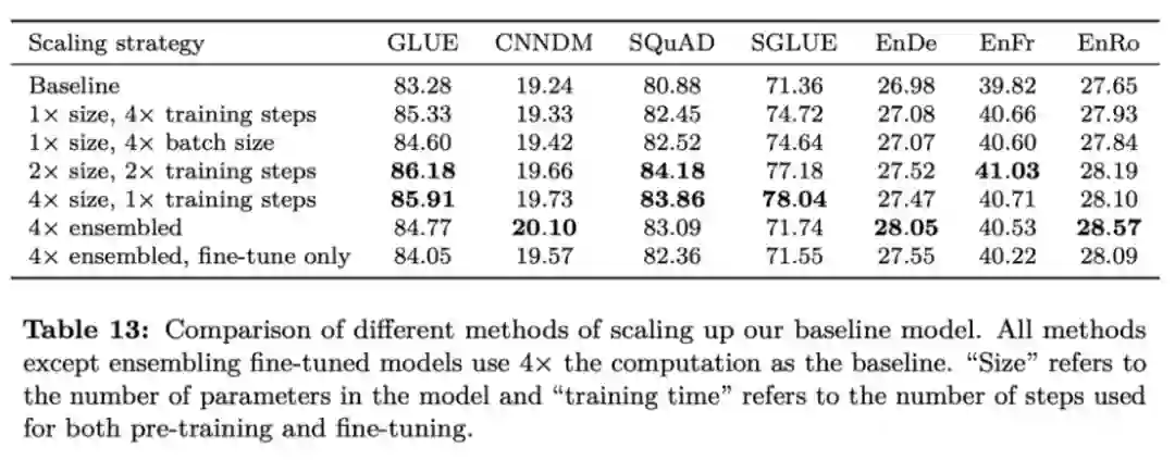 下图为不同的扩展基线模型的方法的对比。除了集成调优模型之外, 所有的方法都以 4 倍的计算量为对比基线。「Size」代表模型中的参数量,「Training time」代表预训练和调优阶段使用的步数。