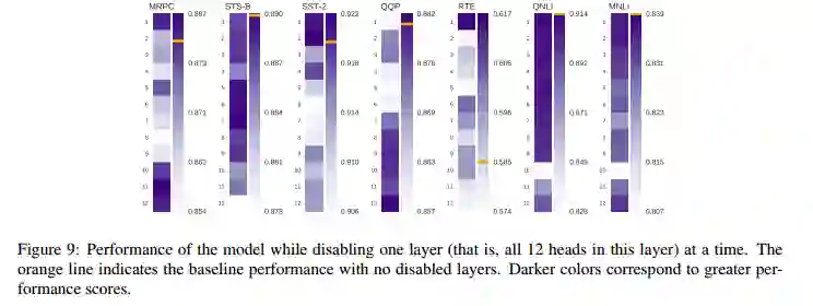 在论文「Revealing the Dark Secrets of BERT」中,作者指出,去掉整个一层的注意力(即给顶层中的 12 个注意力头),也会提升模型的性能。如下图所示,当去除不同的层时,在识别文本蕴含(RTE) 的任务中,去掉第一层注意力会取得极其显著的性能提升(3.2%)。