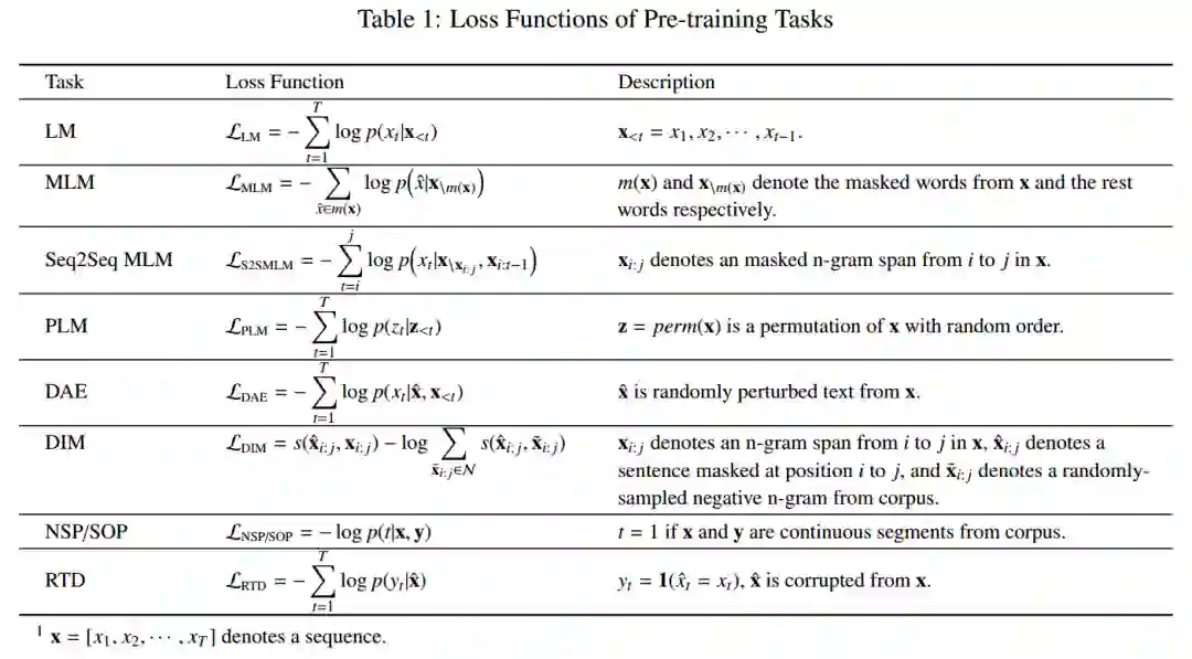 预训练任务对于学习语言的通用表征是非常重要的。通常,这些预训练任务应该是具有挑战性的,并且有大量的训练数据。我们将预训练任务总结为三类:监督学习、无监督学习、自监督学习。