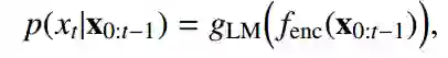 条件概率 p(x_t|x_0:t−1) 可以通过给定语言上下文 x_0:t−1 的词汇集合上的概率分布来建模。通过神经编码器 fenc(.) 对上下文 x_0:t−1 建模,得到的条件概率为: