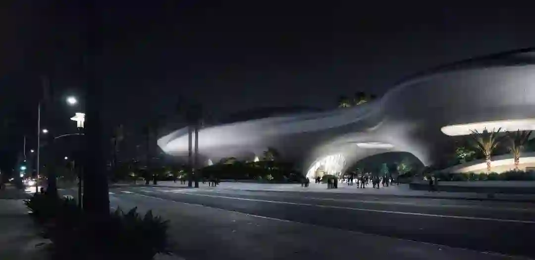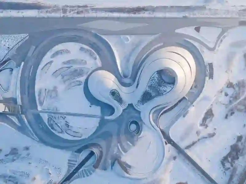 一组从高空俯视的镜头里,哈尔滨大剧院的建筑曲线与该地区的湿地地貌交融在一起,仿佛是地貌景观的一部分,这个观赏角度让人造建筑在自然中的突兀感变到最小。并且哈尔滨大剧院在城市中并不孤立,建筑顶部的平台开放,居民可以通过建筑外部环绕的坡道从周围的公园和广场走到剧院屋顶,眺望松花江南北。