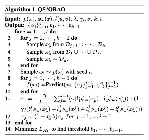 本文考虑在半监督有序回归数据集上通过优化AUC指标来训练分类器。通过二分类分解法,我们给出了半监督有序回归AUC优化的目标函数。同时,针对大规模的带有核的优化问题,我们给出一种基于双重随机梯度的优化算法,QS3ORAO。