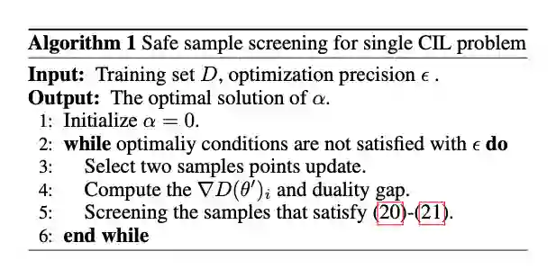 因此我们设计了新的快速数据筛选算法,基于凸函数和凹函数共同表达的框架,我们提供了新的数据筛选规则,并提供理论支持,保证我们的算法可以筛选到所以有代表性的数据,没有遗漏。
