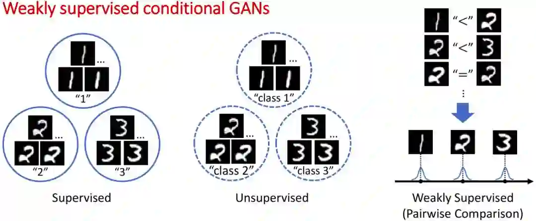 针对这一问题,现有方法大多基于无监督聚类,比如先用无监督学习方法得到伪标注,再用伪标注当作真标注训练CGAN。然而,当目标属性是连续值而非离散值,或者目标属性不能表征数据间的主要差异,那么这种基于无监督聚类的方法就难以取得理想效果。我们进而考虑用弱监督信息去训练CGAN,在文中我们考虑成对比较这种弱监督。成对比较相较于绝对标注具有以下优点:1.更容易标注;2.更准确;3.不易受主观影响。