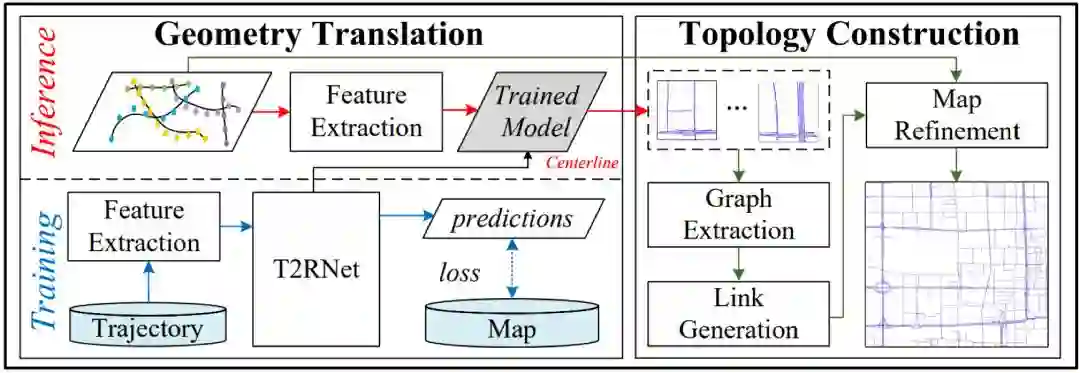 T2RNet通过引入辅助任务道路覆盖区域预测,提升中心线预测的准确性。之后,再次利用轨迹数据精细化得到的路网,保证路网拓扑的联通性以及正确性。