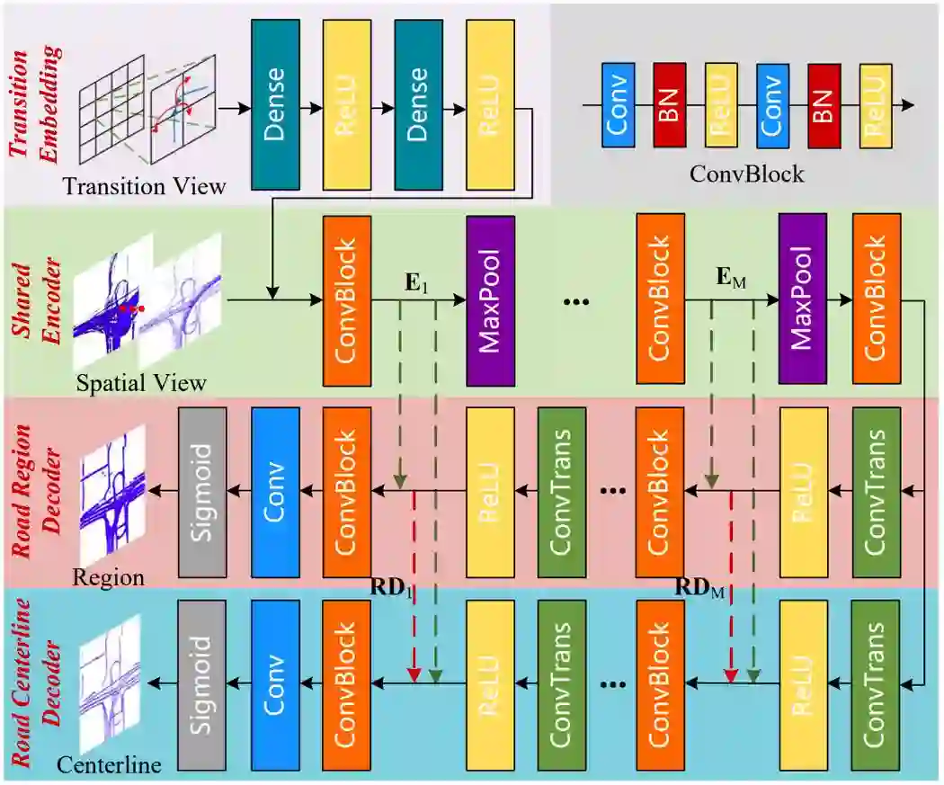 它先从空间视角和转移视角从轨迹中抽取特征,并利用深度卷积神经网络T2RNet(如下图)推测道路中心线。