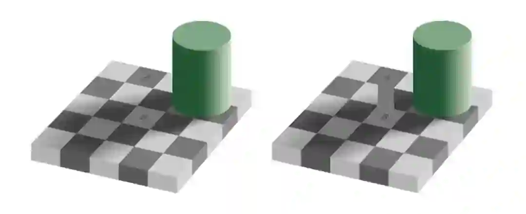 图示为一个著名的视幻觉,棋盘上的格子A看上去比格子B暗得多。但是,其实二者的灰度是完全相同的。大脑会根据附近格子的颜色和圆柱体投下的阴影位置,对棋盘的颜色做出推测。在本例中,这种推测会产生格子A和B的颜色不同的观点,而实际上,二者的颜色是完全相同的。(参考右图,将A和B连在一起即可,若将圆柱体隐藏,看上去还会更明显。)