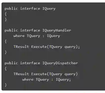 查询——同样的,查询是一个读操作。它读取系统的状态,过滤,聚总,以及转换数据,并将其转化为最有用的格式。它可以执行多次,而且不会影响系统的状态。我之前是使用一个有一些 Execute(…) 函数的类来实现它,但是现在我认为分离成 Query 和 QueryHandler/QueryExecutor 可能会更有用。