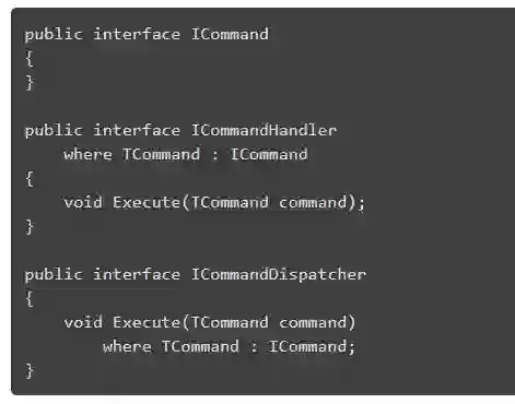 我定义几个接口描述命令和他们的执行环境。为什么我用两个接口来定义一条命令?我这么做是因为我想要保持参数为普通对象,这样就可以不用任何依赖来创建。我的命令 handler 可以从 DI 容器中请求依赖,而且除了在测试中,不需要在任何地方实例化。事实上,ICommand 接口在这的作用相当于标记,来告诉开发者他是否可以将这个类作为命令来使用。