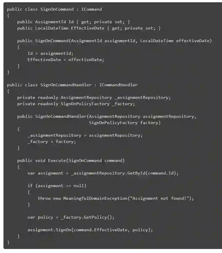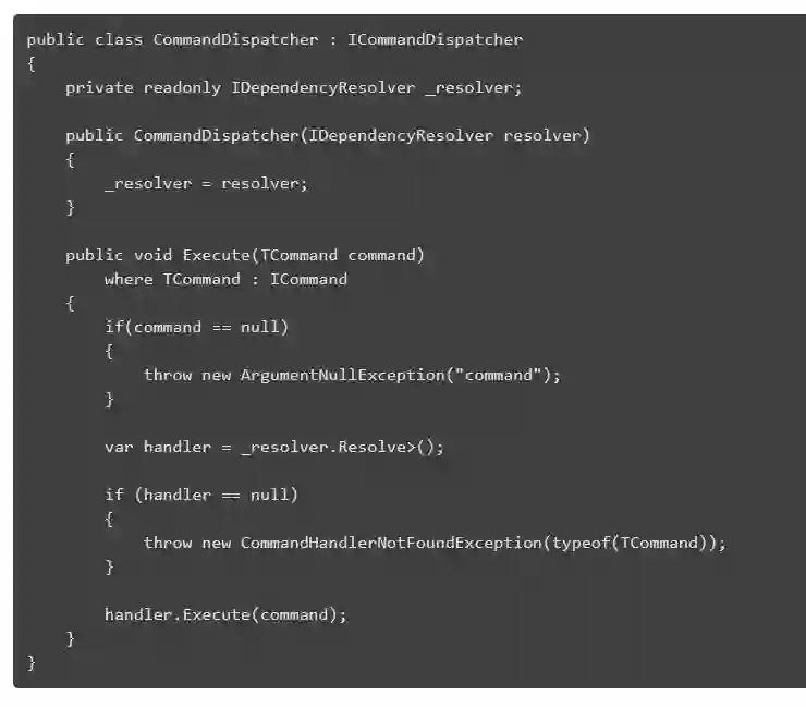我的 CommandDispatcher 相当短,它只负责为给定的命令实例化适当的命令助手并执行它。为了避免手动输入命令去注册和实例化,我已经使用了 DI 容器来做这件事,但如果你不想使用任何 DI 容器,你仍然可以自己做。我说过,这个实现将是简单的,我相信是这样。唯一的问题可能是泛型引入的噪音,它可能刚开始的时候会令人沮丧。这个实现在使用上确实是简单的。下面是一个命令和助手的示例: