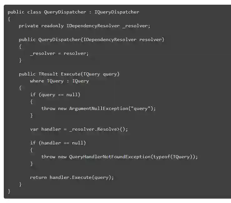 就是这样。QueryDispatcher 看起来很相似,唯一不同是它返回了一些数据,多亏了我之前写的通用代码,Execute 方法返回强类型结果: