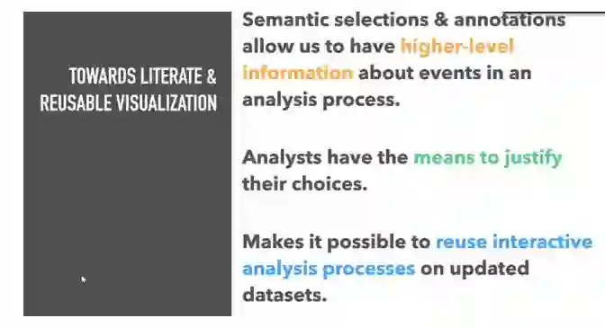 7月7日下午,美国犹他大学(University of Utah)科学计算和成像所(SCI)和计算机学院的副教授Alexander Lex为大家带来了题为“Literate Visualization”的前沿报告。Lex教授对文学式可视分析进行了意义的总结:语义化的交互选择和注释提供了可视分析流程中的高层次信息,可以帮助用户理解可视分析流程;为分析师提供校正可视化设计选择的工具;为将交互式可视分析流程应用到其他数据集上提供了可能性。