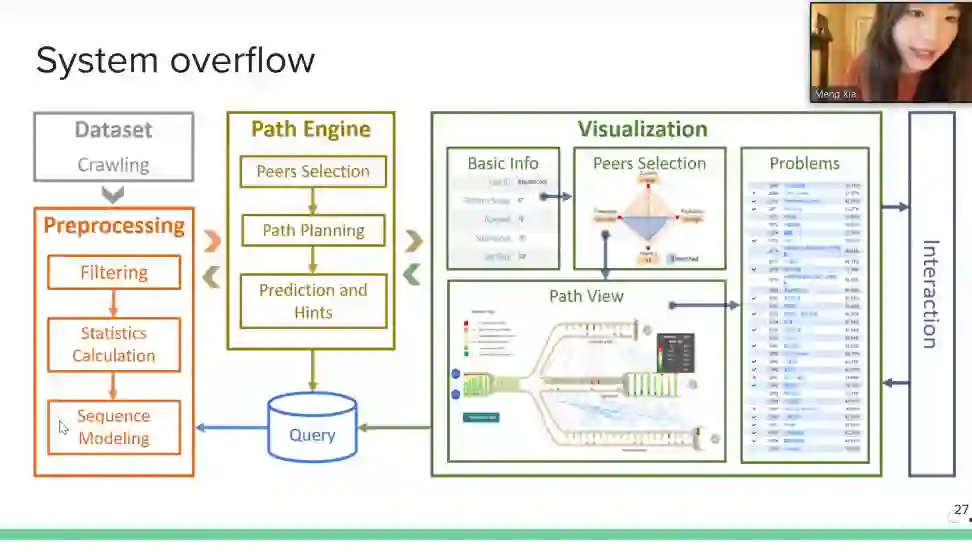 随后,卡内基梅隆大学(Carnegie Mellon University)人机交互研究所的博士后夏梦为同学们带来了“个性化在线学习的交互式可视分析”前沿报告。夏梦博士通过四篇相关论文从多个角度为同学们介绍了个性化在线学习可视分析。她认为目前有很多方法来弥合数据和用户之间的差距,用户有学习者和教育者:学习者可以直观地分析自己的学习数据,以达成学习目标;而教育者可以利用学习者产生的数据来提供个性化的指导。这一领域未来仍有许多挑战等待解决。