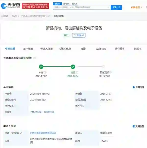 北京小米移动软件有限公司于近日获得了一项“折叠机构、卷曲屏结构及电子设备”专利授权。专利摘要显示,折叠机构包括第一移动板、第二移动板及连杆机构。该专利设置可使待卷曲物体在折叠状态和展开状态之间切换,待卷曲物体可为屏幕,实现屏幕和整机卷曲状态相互配合的功能,达到完整状态的屏幕缩放功能的目的,且缩小整机外观的形态。