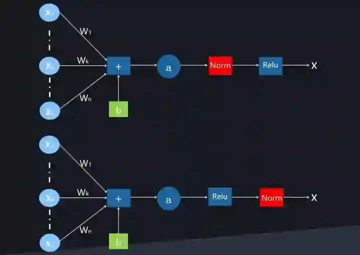 那么对于第一类的Normalization操作,其在什么位置发挥作用呢?目前有两种在神经元中插入Normalization操作的地方(参考图4),第一种是原始BN论文提出的,放在激活函数之前;另外一种是后续研究提出的,放在激活函数之后,不少研究表明将BN放在激活函数之后效果更好。本文在讲解时仍然遵循BN原始论文,后续讲解都可以看成是将Normalization操作放在激活函数之前进行。