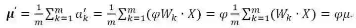也就是说均值也被同比例缩放,这里的关键是因为BN的统计量取值范围是来自于同一个Mini-Batch的实例,所以经过的是用一个神经元,于是对应了相同的边权重向量,那么缩放因子相同,就可以提到求和公式之外。
