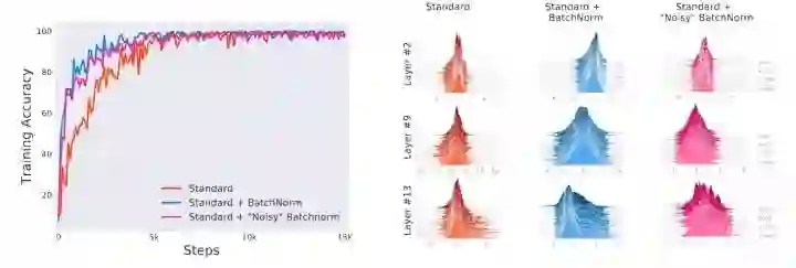 但是能够解决ICS问题其实并不是BN为何有效背后真正的原因,最近有一些研究对此作了探讨。那么ICS问题真实存在吗?ICS问题在较深的网络中确实是普遍存在的,但是这并非导致深层网络难以训练的根本原因。另外,BN解决了ICS问题了吗?其实也没有。实验一方面证明:即使是应用了BN,网络隐层中的输出仍然存在严重的ICS问题;另一方面也证明了:在BN层输出后人工加入噪音模拟ICS现象,并不妨碍BN的优秀表现(参考图19)。这两方面的证据互相佐证来看的话,其实侧面说明了BN和ICS问题并没什么关系。