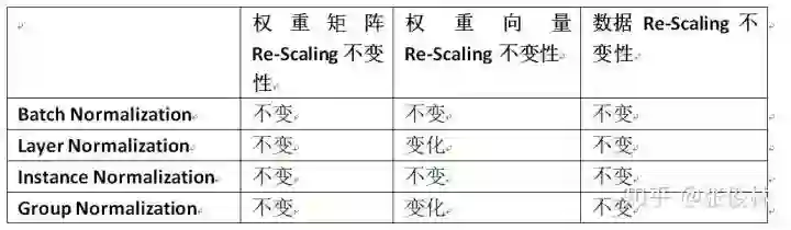 在了解了三种Re-Scaling的含义及Normalization对应的三种不变性特性后,我们先归纳各种Normalization操作所对应的三种Re-Scaling的不变性特性如下表所示(Layer Normalization原始论文分析了LayerNorm及BatchNorm的Re-Scaling不变性,本文作者补充了InstanceNorm及GroupNorm的情况以及细化了推导过程):