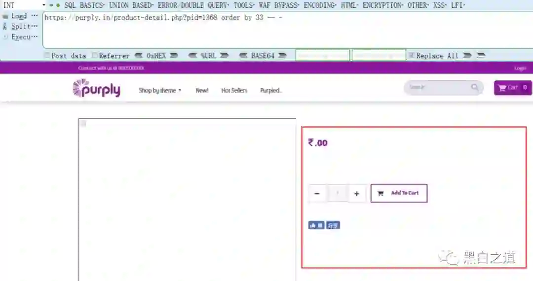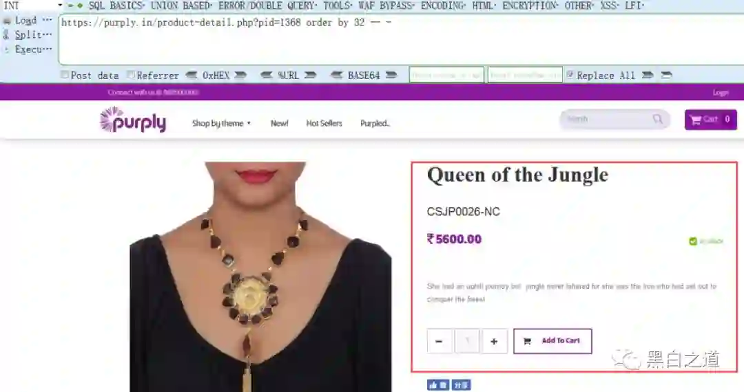 https://purply.in/product-detail.php?pid=1368 order by 32 -- - 先确定字段个数,我们看到,为 32 时页面数据返回正常