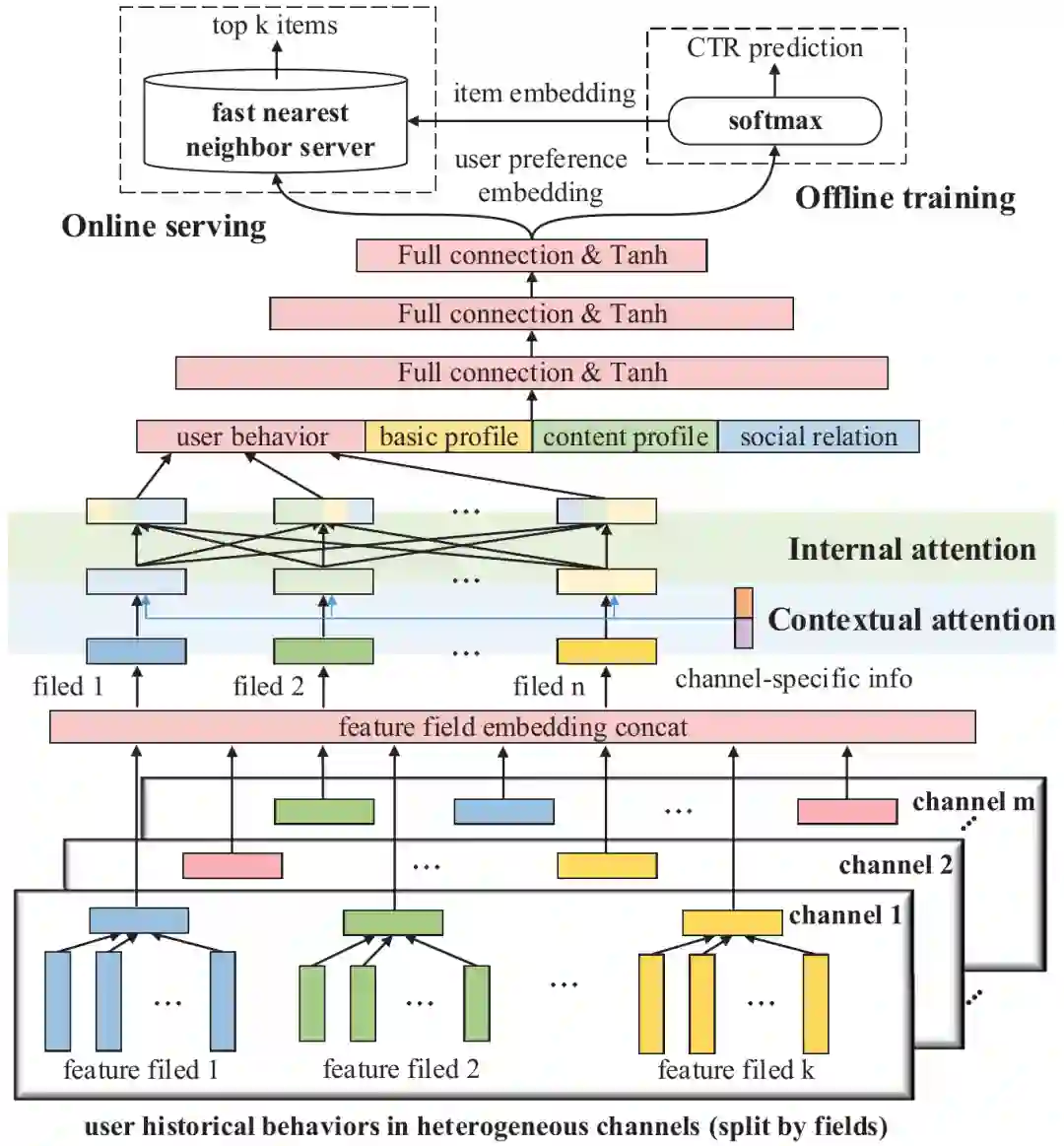 简介:现实世界中集成的个性化推荐系统通常处理数百万种异构项目。由于巨大的计算成本,使用复杂的模型进行完整的语料库检索非常具有挑战性。因此,大多数大型推荐系统由两个模块组成:一个用于有效检索一小部分候选人的多渠道匹配模块,以及一个用于精确个性化推荐的排名模块。但是,在添加新通道或新数据源时,多通道匹配通常会遇到冷启动问题。为解决此问题,我们提出了一种新颖的内部和上下文关注网络(ICAN),该网络突出显示了特定于通道的上下文信息以及多个通道之间的特征字段交互。在实验中,我们通过实际集成推荐系统上的案例研究进行离线和在线评估。重大改进证实了ICAN的有效性和鲁棒性,尤其是对于冷启动通道。目前,ICAN已部署在数百万用户使用的微信热门故事上