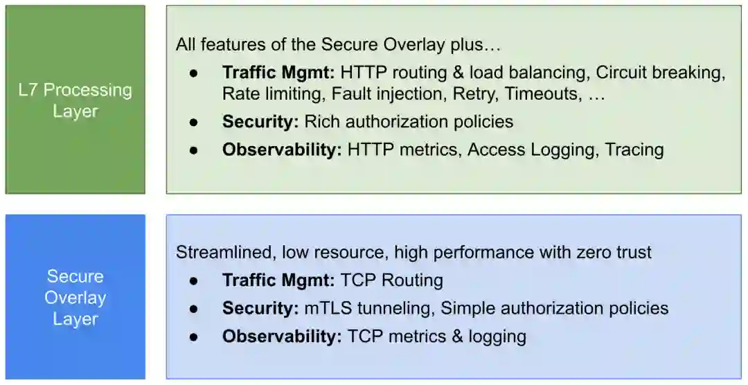 Ambient mesh 采用了不同的方法,它则将 Istio 的功能分成了两层。在底层,有一个安全覆盖层来处理流量的路由和零信任安全。在这之上,用户需要时可以通过启用 L7 处理来获得 Istio 的全部能力。L7 处理模式虽然比安全覆盖层更重,但仍然作为一个 ambient 组件运行,不需要对应用 pod 进行修改。