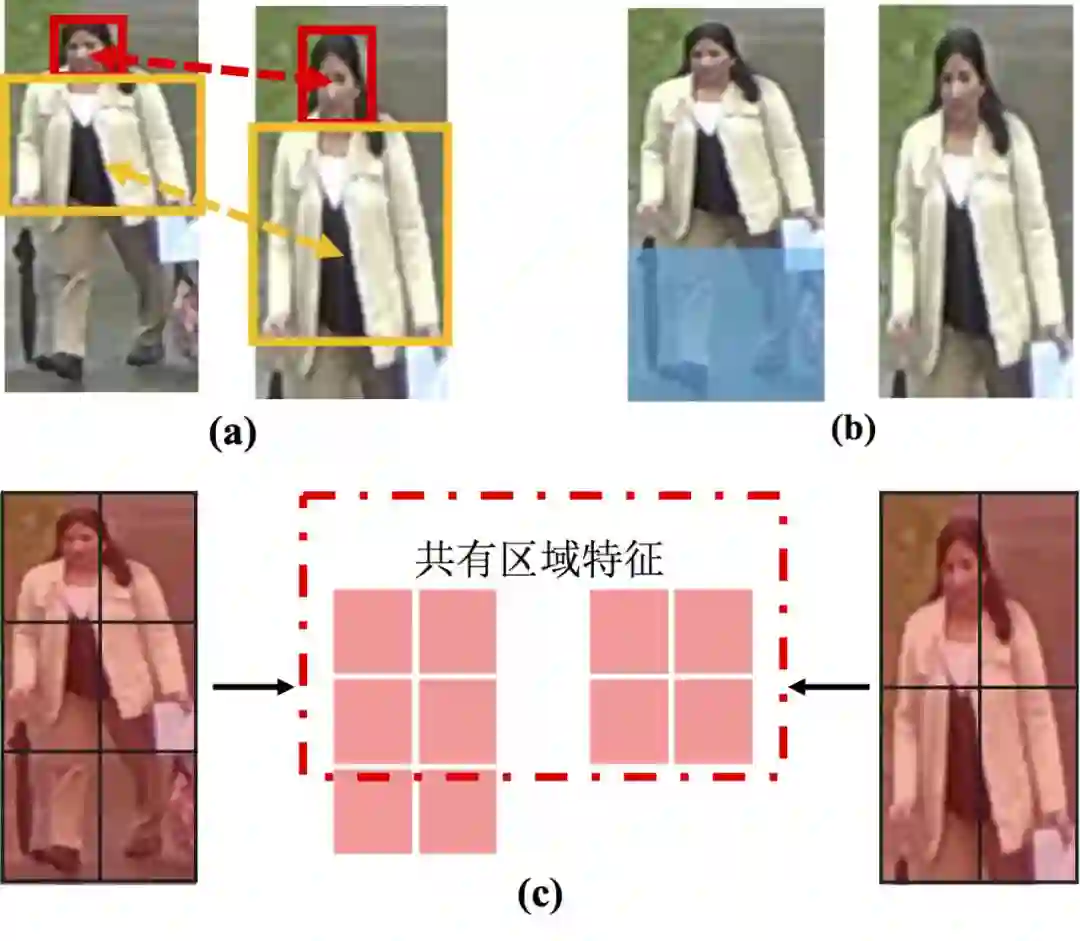 图 3:部分成像下 re-ID 的困难 (a),(b) 及解决思路 (c)