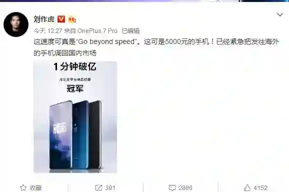 今天中午,一加CEO刘作虎在微博上宣布,一加7 Pro全网销售额1分钟破亿,同时拿下京东全平台单品销量冠军。