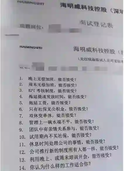 【人力局回应“某公司面试问能否无偿加班”】近日,一张深圳某公司的面试表在网上流传。问题包括是否接受晚上无偿加班、周末无偿加班、拖延提成发放等问题。该公司工作人员回应称,只是调查,对面试结果没有影响。对此深圳市南山区人力资源局办公室表示:已前往该公司调查,问卷上的相关行为若实施则是违法行为,已责令该公司整改。(上游新闻)