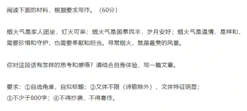最后再来看看天津的题目。不愧是“哏儿都”,今年高考作文题目太接地气了。此时此刻,被封控许久的人们,实在太需要烟火气来重燃对生活的热爱了。