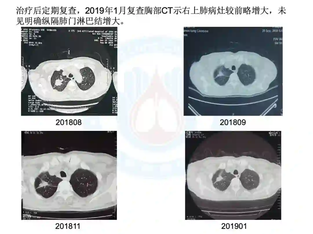 6)给予口服特罗凯治疗,最佳疗效PR(22mm×16mm)。治疗后定期复查,2019年1月复查胸部CT示右上肺病灶较前略增大,未见明确纵隔肺门淋巴结增大。