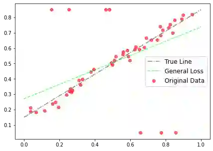 你可以看到的,包含异常值的拟合会受到异常值的影响,但是优化问题应该要求模型受到inliers的影响要大于离群值。当然,在这一点上,你已经可以认为平均绝对误差(MAE)是比MSE更好的选择,因为它对大误差的敏感性较低。有各种类型的稳健性损失(如MAE),对于一个特定的问题,我们可能需要测试各种损失。在训练一个网络的同时,快速测试各种损失函数不是很神奇吗?本文的主要思想是引入一个广义的损失函数,其中损失函数的鲁棒性可以改变,并可以在训练网络的同时训练这个超参数,以提高性能。这比通过执行网格搜索交叉验证来寻找最佳损失所花费的时间要少得多。让我们从下面的定义开始。