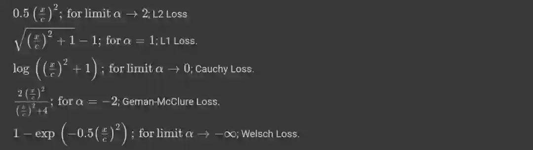 损失相对于α也是单调递增的。这一特性对于损失函数的鲁棒性非常重要,因为我们可以从一个较高的α值开始,然后在优化过程中逐渐(平稳地)减少,从而使鲁棒估计避免局部极小值。