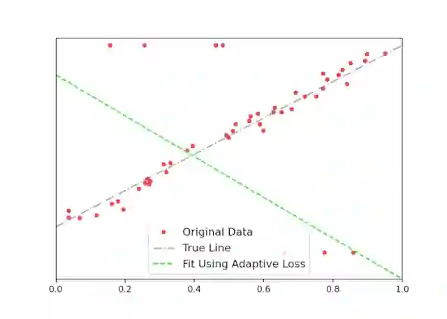 使用这个,以及使用Celluloid模块的一些额外代码,我创建了下面的动画(图5)。在这里,你可以清楚地看到,随着迭代的增加,adaptive loss如何找到最佳拟合线。这个结果接近真实的线,它是可以忽略离群值的影响。