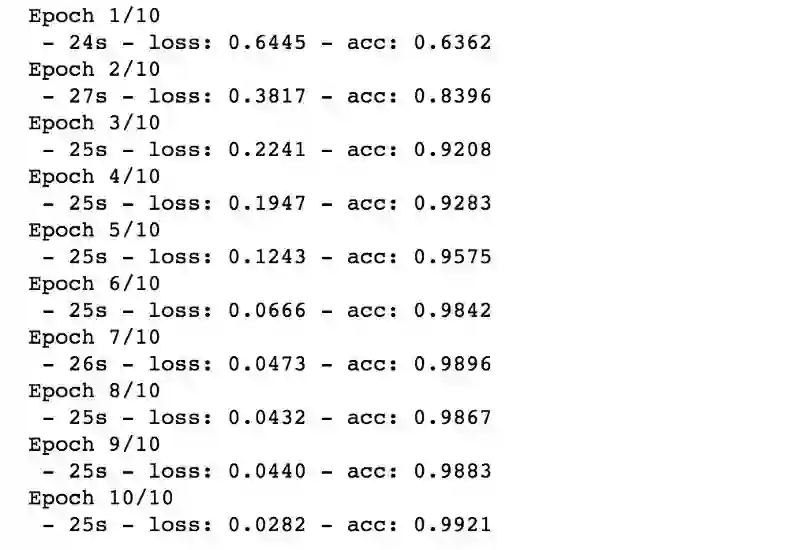 我们现在建立了模型,并对其进行编译、训练和测试。该模型具有嵌入层。输入序列是文本的稀疏表征,因为词汇表巨大,并且给定单词将由大向量表示。如果我们能够构建序列的某种密集表征,那么网络将更容易进行预测。2500 个单词的词嵌入/密集表征是通过嵌入层对模型进行训练获得的。然后,我们将 LSTM 和密集层添加到模型中。LSTM 单元负责进行上下文推断,并帮助预测句子是否积极。密集层输出每个类的概率。本文不详细介绍 LSTM,若想了解其更多信息,请参阅此博客:http://colah.github.io/posts/2015-08-Understanding-LSTMs/。