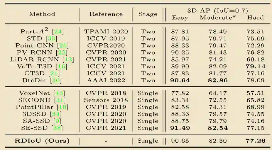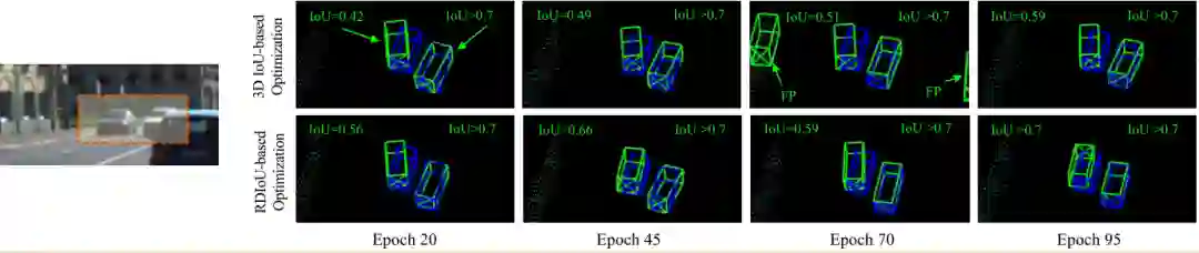 这个也很好理解,类比2D HBBs之间的overlap计算方法就能得到。那么问题就落在怎么确定第四维度的和上。作者的做法是,直接取,而令。可以看到,出发点很有趣,落脚点其实相对简单的。但是这会带来一个直观问题:这个所谓的4D IoU不再能表征3D IoU,有可能导致损失和评估的不一致。作者通过下面的实验证明了提出的RDIoU的有效性: