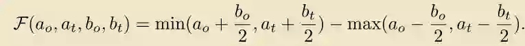 作者为了解耦角度对IoU的影响,比较有趣地引入了第四维度地概念,将角度视作类似于3维bbox中长宽高之外的第四维度,然后重新计算四维空间的“IoU”。3D box表征由中心和形状组成,变成四维就是中心和形状。对于这个4D的表征,个人感觉可以理解成四维空间的的“水平包围框”,从而不难理解作者的IoU计算方式了。IoU表达式很简单: