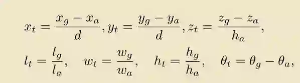 其中d是anchor在2D平面上的对角线长。ps: 实际上很多方法,包括作者的实现代码使用的并不是这种做法,而是类似2D通用检测的anchor offset encoding(参考Faster RCNN)。