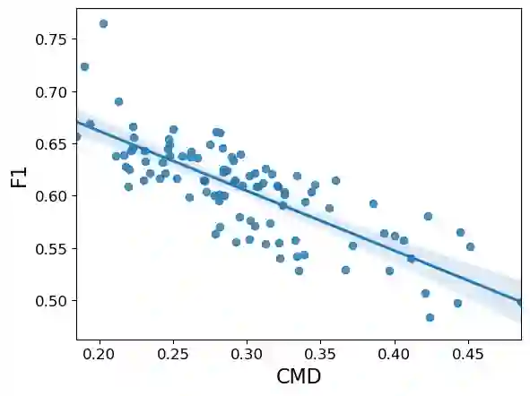可以看到,数据集的分布偏移与分类准确率之间存在着强烈的负相关:随着CMD的增加,性能(F1)显著下降。也就是说,GNN可能难以泛化,因为训练数据看起来不太像测试数据集。