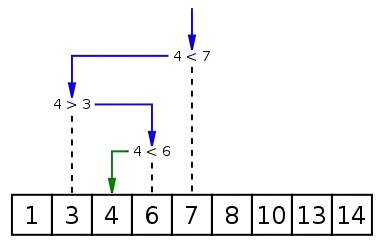 二分搜索(英语:binary search),也称折半搜索(英语:half-interval search),对数搜索(英语:logarithmic search),是一种在有序数组中查找某一特定元素的搜索算法。搜索过程从数组的中间元素开始,如果中间元素正好是要查找的元素,则搜索过程结束;如果某一特定元素大于或者小于中间元素,则在数组大于或小于中间元素的那一半中查找,而且跟开始一样从中间元素开始比较。如果在某一步骤数组为空,则代表找不到。这种搜索算法每一次比较都使搜索范围缩小一半。