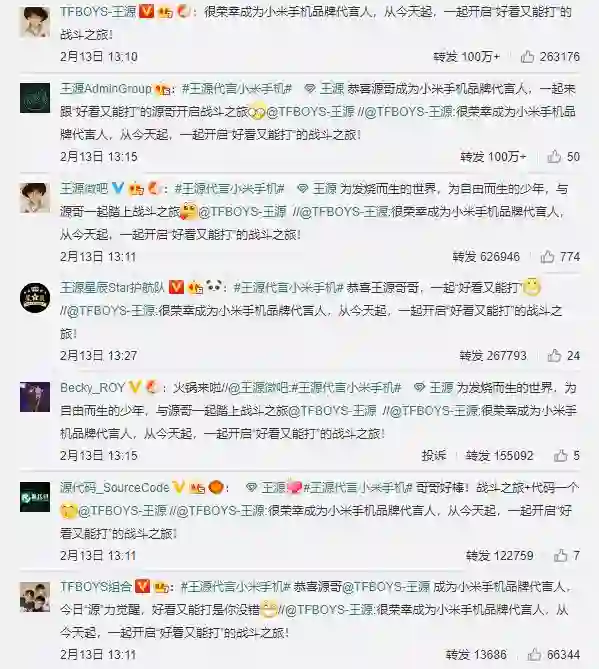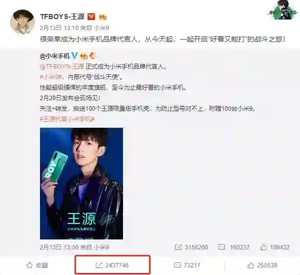 而最近,小米官方宣布王源正式成为小米手机品牌代言人,又一顶级流量明星加入了小米手机代言人行列。这条微博已发布,小米的官博就获得了三百万以上的转发量,王源的个人微博上的转发量也突破了两百万。