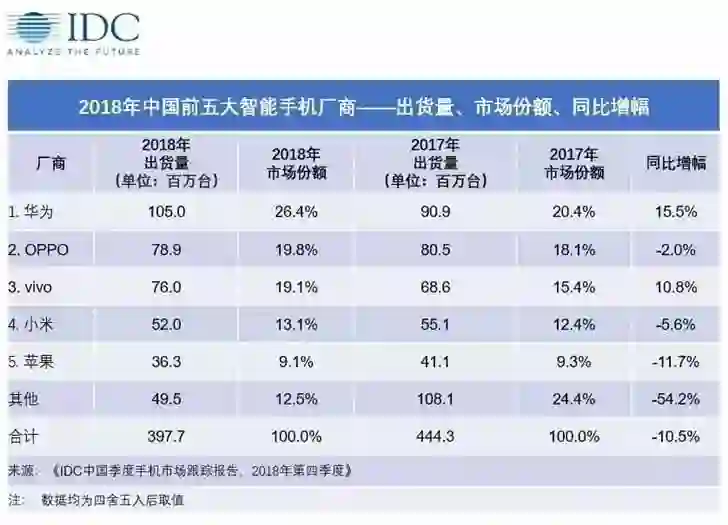 当然OV也是尝到了宣传营销的甜头,根据IDC公布的2018年中国前五大智能手机厂商中,OV分别位列第二第三位,这与其营销上的成功有着分不开的联系。