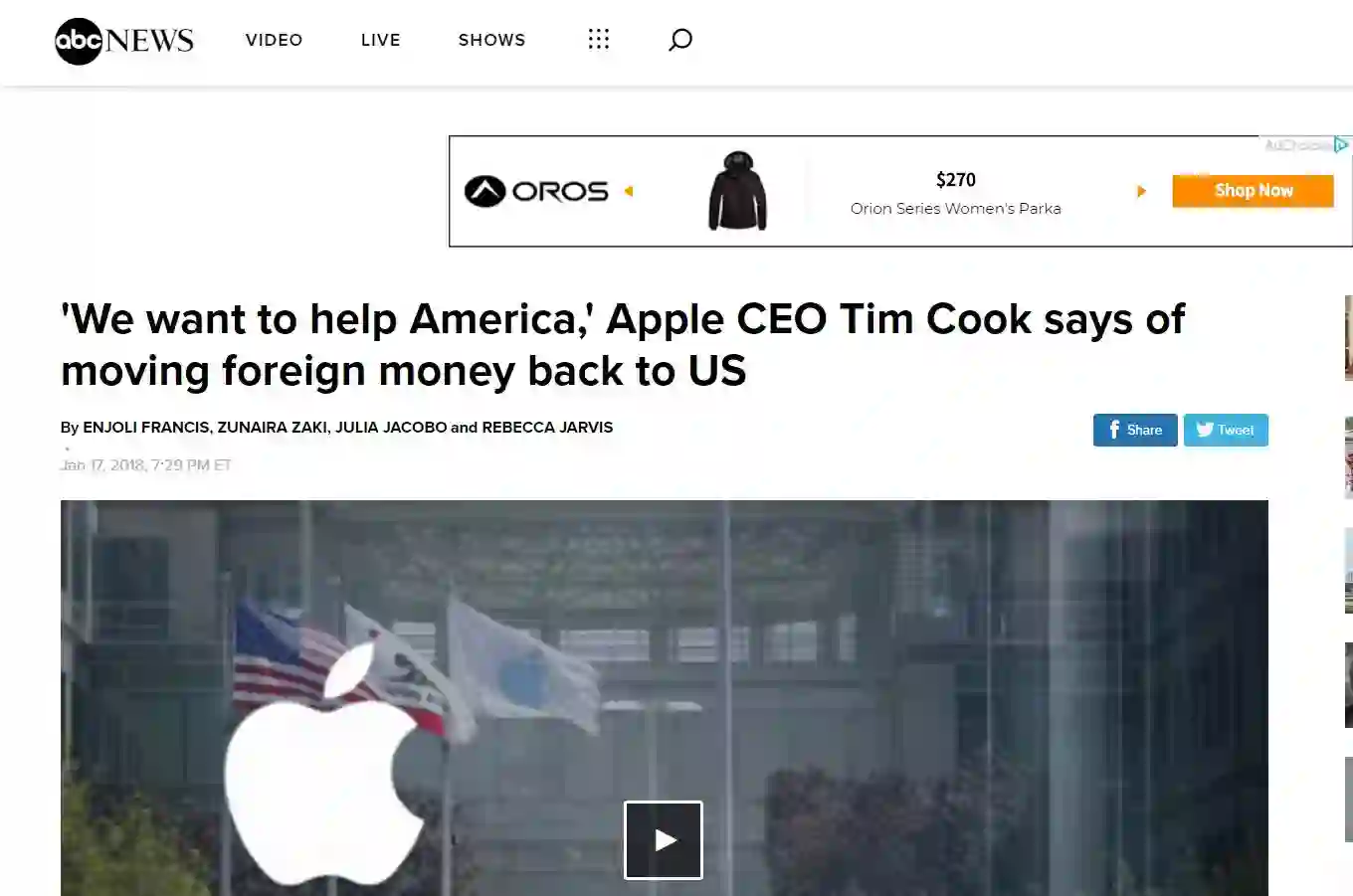 当然,苹果公司也对美国的税收政策感到担忧,他们表示:“因为美国税收法律修改,导致我们又要多付380亿(约合人民币2444亿元)美元的税收。