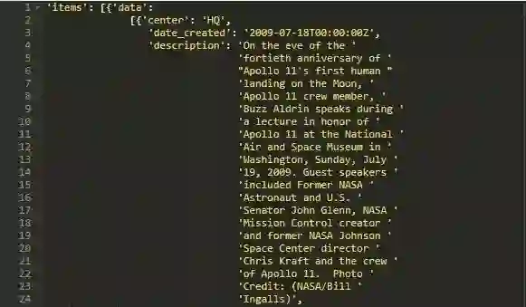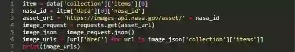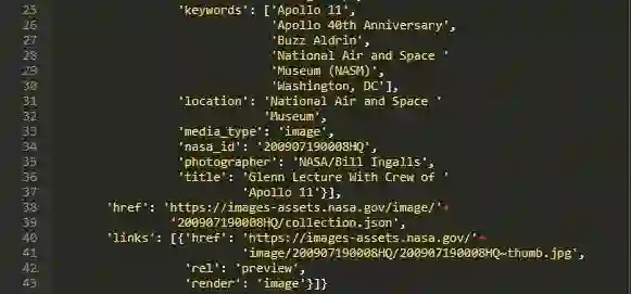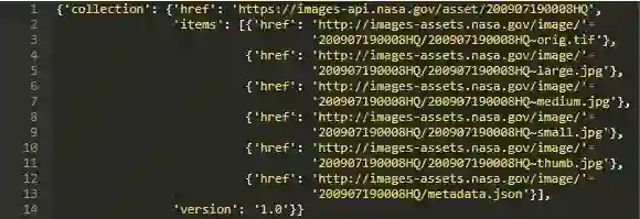 由此可以获取JSON的第一个项。然后可以解析出nasa_id,用于获取与此特定结果关联的所有图像。接下来可以将nasa_id添加到新URL并发出请求。