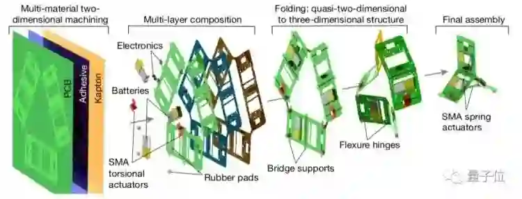 扁平的材料由PCB板和聚合物构成,再经过几个折叠,二维结构就变成了三维结构,这样的设计保证了机器人的可扩展性。