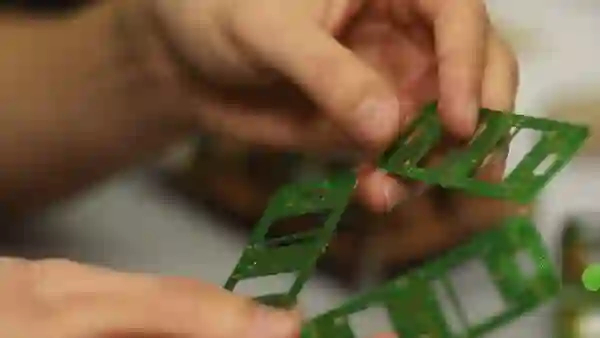 PCB板后面则粘了Kapton聚酰亚胺层,这两个层通过粘合剂膜粘合在一起,并要在160℃和90N压力下热压2分钟,形成了柔性铰链,为机械蚁提供柔韧性。