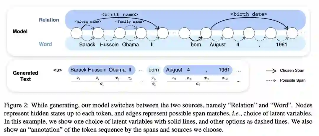本文提出了一种潜在关系语言模型(LRLMs),这是一类通过知识图谱关系对文档中词语的联合分布及其所包含的实体进行参数化的语言模型。该模型具有许多吸引人的特性:它不仅提高了语言建模性能,而且能够通过关系标注给定文本的实体跨度的后验概率。实验证明了基于单词的基线语言模型和先前合并知识图谱信息的方法的经验改进。定性分析进一步证明了该模型的学习能力,以预测适当的关系在上下文中。