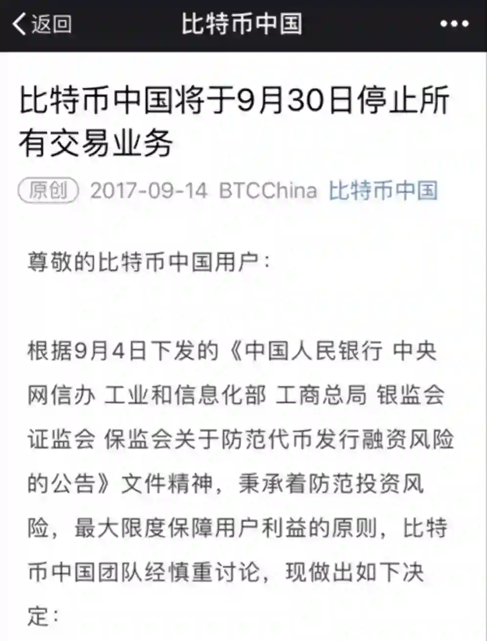 另一个即将退出我们视线的还有比特币交易,9月14日,比特币交易所比特币中国称,将于9月30日停止所有交易业务。以下为比特币中国公告: