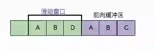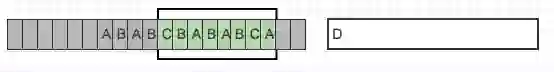 LZ77的主要算法逻辑就是,先通过前向缓冲区预读数据,然后再向滑动窗口移入(滑动窗口有一定的长度),不断的寻找能与字典中短语匹配的最长短语,然后通过标记符标记。我们还以字符ABD为例子,看如下图: